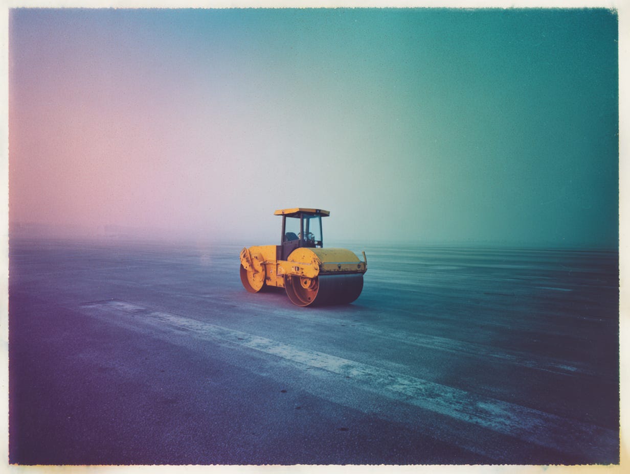 I had never driven a road roller before, so it took some trial and error to figure out the controls. It crawled forward slowly, no faster than a jog at best. After a few turns, I realized what I had to do: find the button and crush it beneath the roller. The machine was heavy enough. It had to be. The problem was, I no longer remembered which direction I had come from. My only option was to choose a path at random, then return and try another if I found nothing. I set my jacket on the ground to mark the spot and rolled out. By roughly timing how long it had taken me to reach the road roller, I could guess how far to search before giving up and circling back. My first attempt failed. The second failed too. And the third. By then, the sun was burning into the back of my neck, merciless now that I no longer had my jacket.